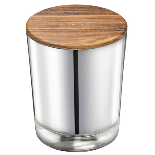 The natural-colored candle creates a contrast with the glossy surface of the large glass. The glass container is covered with a precious zebrano wood lid, embossed with the silver LINARI logo. The lid can be used decoratively and as a coaster for this or any other candle or aromatic diffuser in the LINARI series.